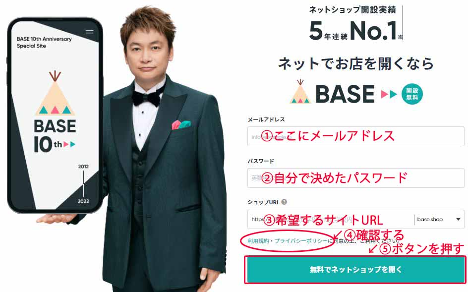 まずは、BASEの申し込みページ に入って、3つの項目を埋めてください。